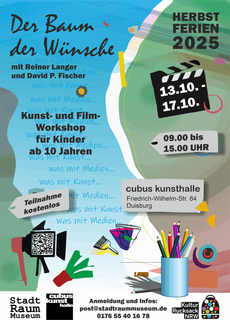 Die künstlerische Leitung übernimmt der Dinslakener Künstler Reiner Langer. Gemeinsam mit dem Bonner Medienpädagogen David P. Fischer begleitet er die Kinder durch den gesamten Prozess und eröffnet neue kreative Ausdrucksmöglichkeiten. Die Ergebnisse werden öffentlich in der cubus kunsthalle präsentiert.